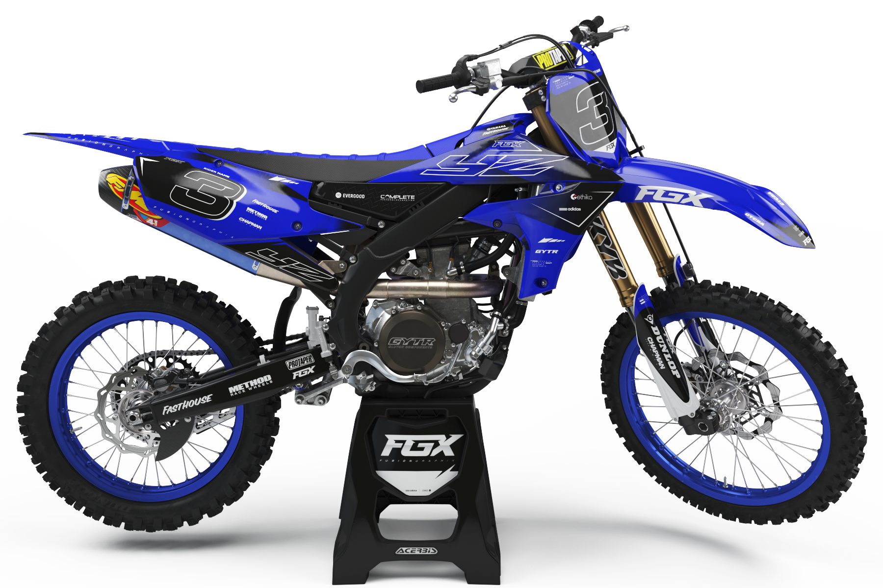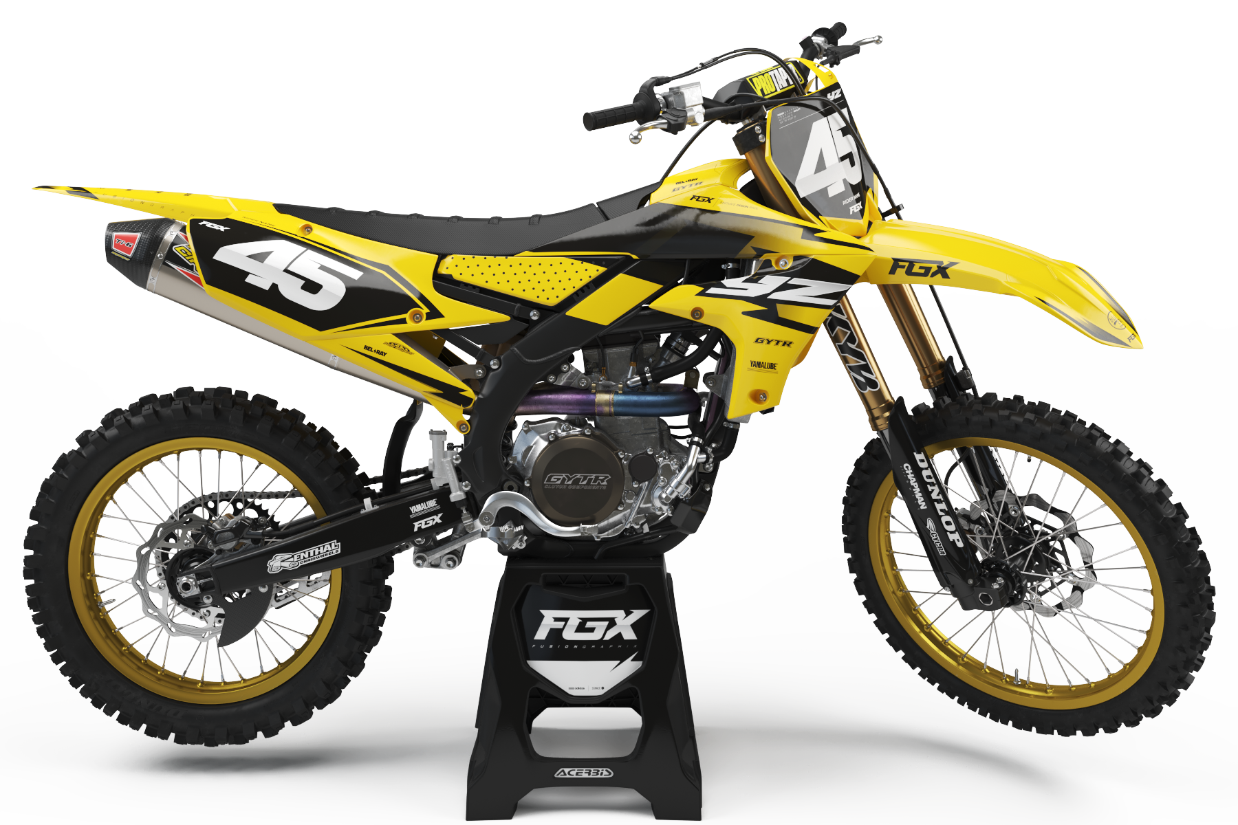 Suspension Decal Kits includes: 1 pair of Fork Tube Decals, 1 pair of Suspension Settings Decals and 1 pair of Rear Shock Decals. Our material is made of a heavy duty thick, super high gloss material. It is very conformable and withstands the toughest abuse.